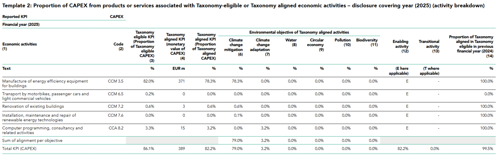Rockwool’s Taxonomy disclosure in its 2025 Annual Report reflects the revised Annex II format of the Regulation.