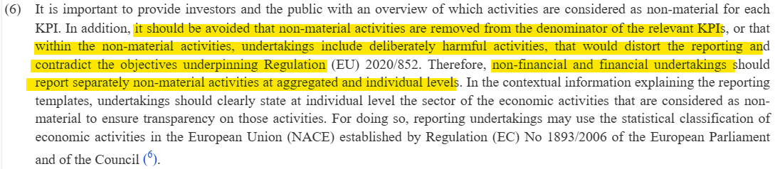 Recital (6) indicates that it “should be avoided” that non-material activities are removed from the denominator and that undertakings include deliberately harmful activities within the non-material portion.