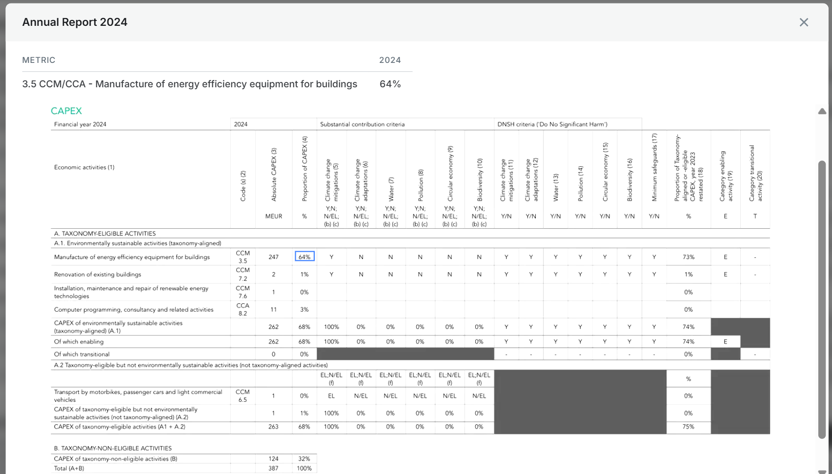 - If the row referred to aligned (A1) activities, a figure of 10% under Climate Change Mitigation (CCM) meant that 10% of the KPI was taxonomy-aligned to that objective.