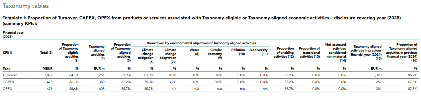 Under the 2026 templates, DNSH and MSS are embedded in the alignment outcome itself rather than shown as separate checklist-style disclosures. The tables focus on the quantitative share of aligned activities, while the procedural elements underpinning alignment are not presented in standalone columns.