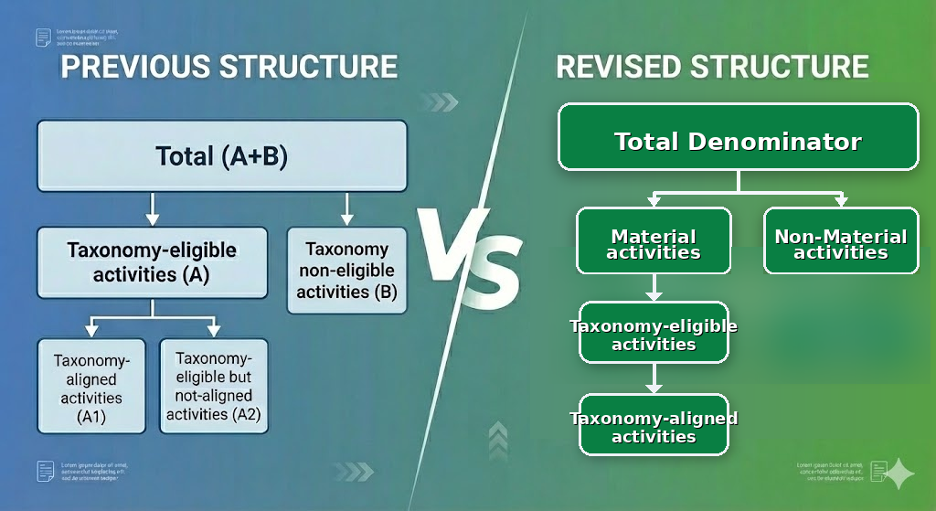 The familiar A+B, A, A1, A2 and B categorization is no longer the starting point of the reporting logic. The change does not, in itself, modify the underlying eligibility or alignment criteria. Instead, it introduces a materiality filter that determines which activities enter the eligibility and alignment assessment.